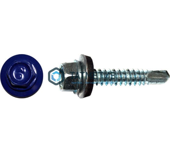 Кровельный саморез КРЕП-КОМП 5,5x19, RAL5002, ультрамарин, 250 шт. ск55195002кф окрашен по каталогу RAL, имеет шестигранную головку под ключ-насадку 8 мм и шайбу с резиновой прокладкой толщиной. Это даёт защиту от попадания влаги под крепёж. Окраске подвергается только головка и верхняя часть шайбы. Используется только высококачественная порошковая краска, в результате чего, покрытие не крошится и не отслаивается. На конце кровельного самореза сверло РТ-3, которое может просверлить металл толщиной до 6 мм и не сломаться.