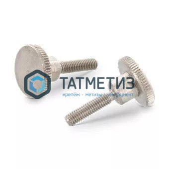 Винт DIN 464 с высокой накатанной головкой и противоскользящим ребром, круглый цилиндрический подголовник и метрическая резьба по всей длине винта.