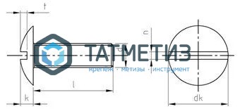 Винт с увеличенной полукруглой головкой и прямым шлицем. У крепежа имеется полная метрическая нарезка и низкая полукруглая увеличенного размера головка, с небольшим углублением под плоскую отвертку для работы вручную. Широкое углубление на шляпке позволяет не использовать шайбы для крепления легко деформируемых материалов (тонкий металл, пластик, древесина).
