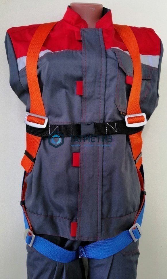 Привязь состоит из набедренных и наплечных лямок, и одного D-кольца, который крепится на спине.